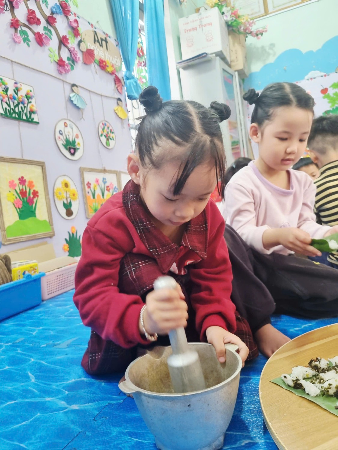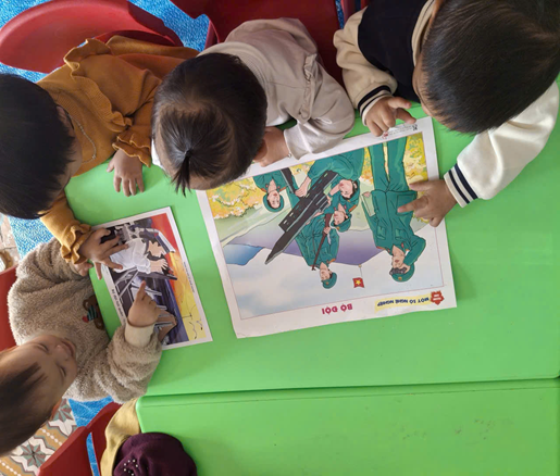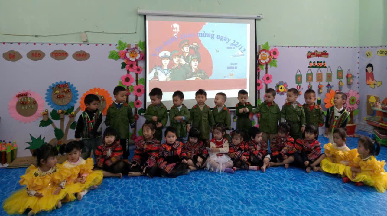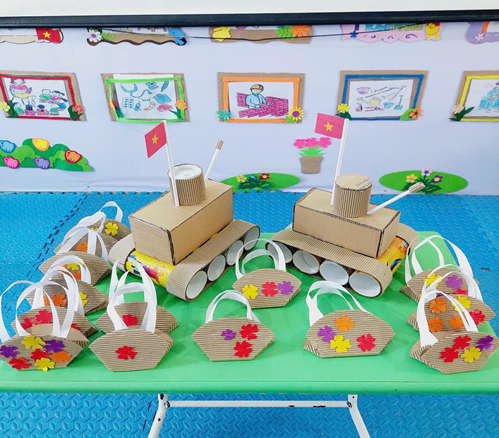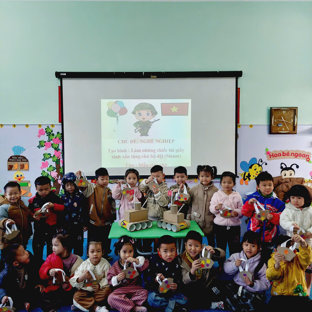 Tại các lớp học, các con được tham gia nhiều hoạt động trải nghiệm phù hợp với lứa tuổi như: Tìm hiểu về chú bộ đội, xem tranh ảnh, tập làm chú bộ đội, nghe kể chuyện truyền thống, làm quà tặng chú bộ đội, làm cơm nắm muối vừng, hát múa tặng chú bộ đội... Qua đó, các con được gieo mầm những giá trị tốt đẹp về lòng yêu nước, sự biết ơn và tinh thần đoàn kết.